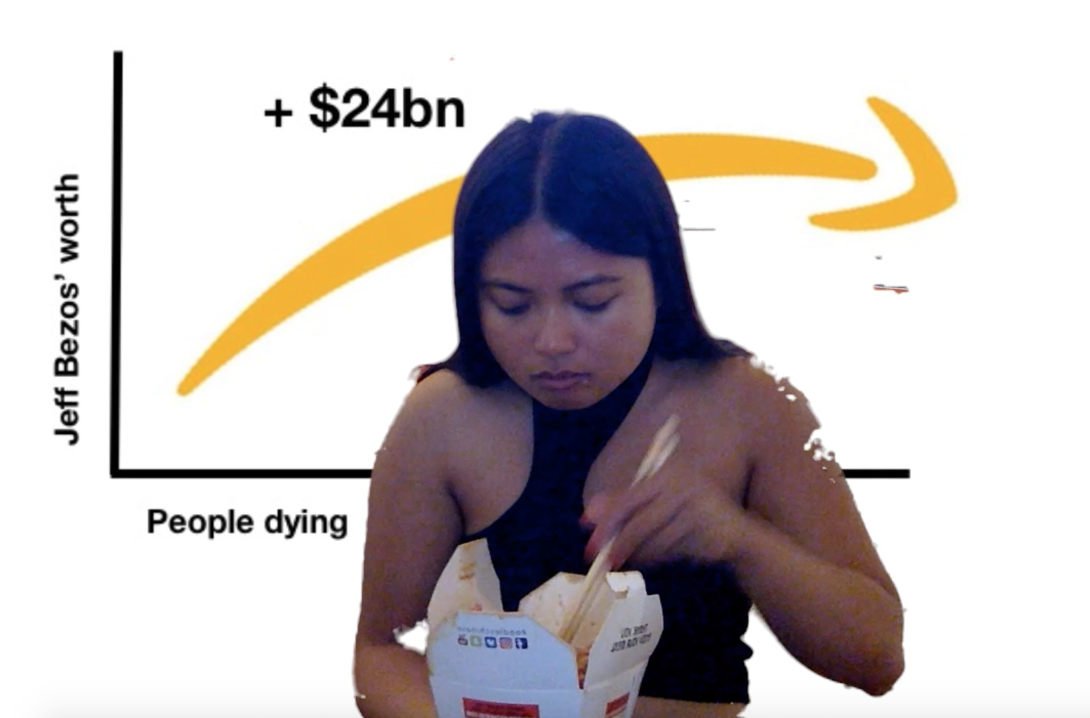 Made at the height of the 2020 UK lockdowns, this video performance piece aims to subvert the concept of the ‘curvature’ plotted on the world’s coronavirus fatalities graph. By substituting an upside down Amazon smile logo with this curve, and plotting it on a graph that simultaneously shows the increase in net worth of the company’s CEO, Jeff Bezos, with the world’s rising death toll, the piece presents one man’s financial gain alongside the loss of life since the pandemic began. Although the two are not directly linked, this idea puts into question the value of human life versus capital in the age of COVID-19. The artist records herself eating Chinese takeaway on the PhotoBooth app to tie in key concepts. Namely, the closure of many dine-in restaurants which have been replaced by the food delivery industry (and the dangers this might impose on its low-paid workers); the stigma and racist ideologies that are starting to form around Chinese and Asian communities due to the origins of the virus; and the imposition of lockdown measures pushing most human interactions (like eating together) into the virtual.